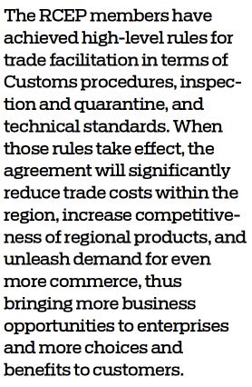 In addition, the RCEP members have achieved high-level rules for trade facilitation in terms of Customs procedures, inspection and quarantine, and technical standards. When those rules take effect, the agreement will significantly reduce trade costs within the region, increase competitiveness of regional products, and unleash demand for even more commerce, thus bring more business opportunities to enterprises and more choices and benefits to customers.