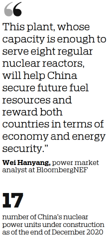 Wei Hanyang, a power market analyst at research firm BloombergNEF, said the need for uranium resources by China's nuclear power generators will rise in the long term.