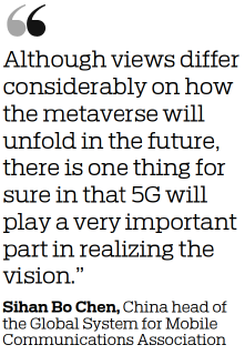 Sihan Bo Chen, China head of the Global System for Mobile Communications Association, an international global telecommunications industry body, said, "Although views differ considerably on how the metaverse will unfold in the future, there is one thing for sure in that 5G will play a very important part in realizing the vision."