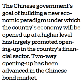 The Chinese government's goal of building a new economic paradigm under which the country's economy will be opened up at a higher level has largely promoted opening-up in the country's financial sector. Two-way opening-up has been advanced in the Chinese bond market.