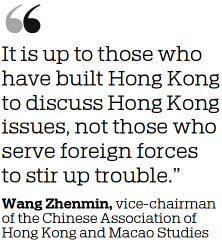 All of the candidates in the recent election were patriots who love Hong Kong, said Wang, who is also director of Tsinghua University's Center for Hong Kong and Macao Studies. "It is up to those who have built Hong Kong to discuss Hong Kong issues, not those who serve foreign forces to stir up trouble," he said.