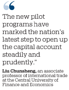 "The new pilot programs have marked the nation's latest step to open up the capital account steadily and prudently," said Liu Chunsheng, an associate professor of international trade at the Central University of Finance and Economics in Beijing.