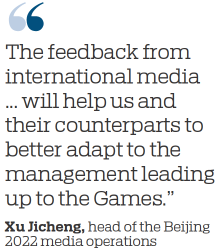 "The experiences of working and living within the loop are getting better, with the operation being perfected," Xu Jicheng, head of the Beijing 2022 media operations, said during a briefing at the media center.