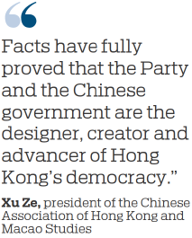Xu Ze, president of the Chinese Association of Hong Kong and Macao Studies, said since Hong Kong's return to the motherland in 1997, the central government has firmly supported it in developing democracy in accordance with the law and in an orderly manner.