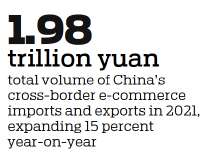 The latest data from the General Administration of Customs showed China's cross-border e-commerce imports and exports totaled 1.98 trillion yuan ($311.9 billion) in 2021, expanding 15 percent year-on-year. Exports totaled 1.44 trillion yuan, up 24.5 percent on a yearly basis.