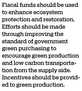 Fifth, fiscal support shall also be placed in the area of green finance. Fiscal funds should be used to enhance ecosystem protection and restoration. Efforts should be made through improving the standard of government green purchasing to encourage green production and low carbon transportation from the supply side. Incentives should be provided to green production. Research should be rolled out with corresponding tax breaks related to cutting carbon emissions. Existing tax breaks for environmental protection, water conservation and new energy-as well as clean energy-must be fully implemented on the ground.