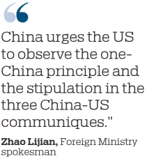 "China urges the US to observe the one-China principle and the stipulation in the three China-US communiques, ... and stop its arms sale to and military contacts with Taiwan," Zhao said.