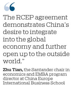 "The RCEP agreement demonstrates China's desire to integrate into the global economy and further open up to the outside world," said Zhu Tian, the Santander chair in economics and EMBA program director at China Europe International Business School, or CEIBS, in Shanghai.
