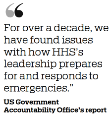 The GAO's concerns about the department span four presidential administrations and public health emergencies, ranging from infectious-disease outbreaks such as Ebola and Zika to extreme weather events such as hurricanes.