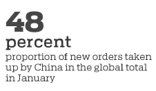 In January, China took the lion's share in the global shipbuilding order book by receiving 48 percent of the world's newbuild orders, or 1.47 million compensated gross tonnages (CGT), said British shipbuilding industry tracker Clarkson Research Services.
