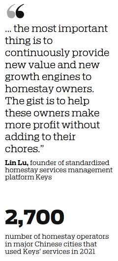 Lin Lu, founder of seven-year-old standardized homestay services management platform Keys, also had to deal with the contraction of the business, especially in urban areas. While more than 20,000 homestay operators in major Chinese cities used Keys' services prior to the pandemic, that number plummeted to 2,700 in 2021.
