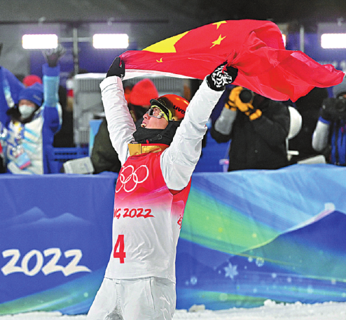 The 31-year-old native of Xuzhou, Jiangsu province, was the only skier on Wednesday night who attempted the super-difficult trick to land cleanly in the gut-wrenching knockout format, which saw half of the 12 finalists eliminated following the first two runs before the final six battled it out in the medal round with a third run.