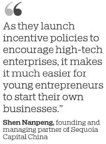 "Local provincial governments are also starting incubators and guiding funds. As they launch incentive policies to encourage high-tech enterprises, it makes it much easier for young entrepreneurs to start their own businesses," Shen said.