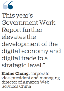 "This year's Government Work Report further elevates the development of the digital economy and digital trade to a strategic level," said Elaine Chang, corporate vice-president and managing director of Amazon Web Services China.