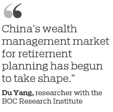 "China's wealth management market for retirement planning has begun to take shape," said Du Yang, a researcher with the BOC Research Institute. "Supply of pilot WMPs for retirement planning has diversified, thus laying a solid foundation for the further promotion of such products."