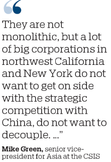 Mike Green, senior vice-president for Asia at the CSIS, said that the debate over China policy, however, is less populist and takes place more in the private sector, specifically Silicon Valley and Wall Street, and within the national security community.