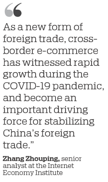 "As a new form of foreign trade, cross-border e-commerce has witnessed rapid growth during the COVID-19 pandemic, and become an important driving force for stabilizing China's foreign trade," said Zhang Zhouping, a senior analyst on business-to-business and cross-border activities at the Internet Economy Institute, a domestic consultancy.