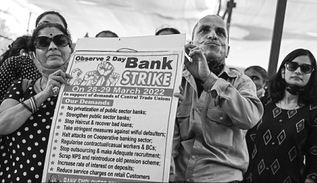 Bank unions are protesting against the government's move to privatize two public sector banks as announced in this year's general budget. They are also demanding an increase in the interest rate on deposits and a reduction in service charges.