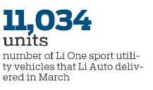 Electric vehicle pioneer Li Auto said it delivered 11,034 of its Li One sport utility vehicles, or SUVs, in March, up 125.2 percent year-on-year. For the first quarter, Li Auto said it had delivered 31,716 vehicles, an increase of 152.1 percent year-on-year.