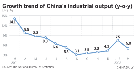 China's industrial output grew 5.0 percent year-on-year in March, reflecting the resilience of the nation's sprawling industrial economy, but more efforts are needed to deal with the increasing pressure of COVID-19 on industrial production, experts said.