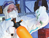 They are required to wear protective clothes to disinfect goods at the gate of the community, and then they place the goods at unit doorways after informing residents of the delivery via building intercom.
