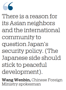 "There is a reason for its Asian neighbors and the international community to question Japan's security policy," said Wang, urging the Japanese side to stick to peaceful development and act with prudence in the military and security fields.