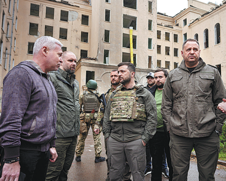 Zelensky's office posted a video on the Telegram platform of the president wearing a bulletproof vest while viewing destroyed buildings in Kharkiv and its surroundings.