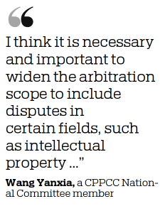 The jurisdiction of China's arbitration authorities should be further expanded to include more disputes, such as those involving intellectual property rights, international investment, sports and anti-monopoly, national political advisors suggested.