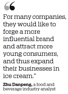 "Ice cream is one of the favorite categories of young consumers, and it has seen positive growth in the past few years. For many companies, they would like to forge a more influential brand and attract more young consumers, and thus expand their businesses in ice cream," said Zhu Danpeng, a food and beverage industry analyst.