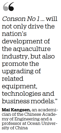 "Conson No 1 has made China's vision of deep-sea aquaculture into a reality, and will not only drive the nation's development of the aquaculture industry but also promote the upgrading of related equipment, technologies and business models," said Mai Kangsen, an academician of the Chinese Academy of Engineering and a professor at Ocean University of China.