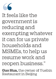 That should explain why they figure prominently in all economic relief packages. For instance, in Beijing's Dongcheng district, where Yuebin Restaurant is located, a special relief plan reduced rent, utility fees and taxes besides helping lower social security fees.