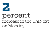 The ChiNext closed 2 percent higher on Monday, the seventh consecutive trading day it has risen. However, the benchmark Shanghai Composite Index slid marginally.