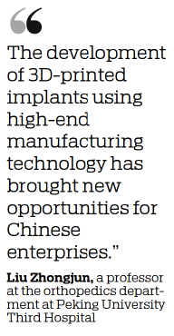 Liu Zhongjun, a professor at the orthopedics department at Peking University Third Hospital, said 3D-printing technology can fulfill clinical demand for customized implants to realize treatment outcomes that cannot be achieved with traditional modalities.
