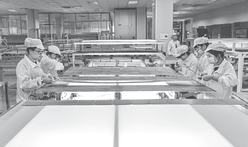 GUANGZHOU-Erected on seawater, an array of photovoltaic panels glow in the sun while fishermen paddle between them.