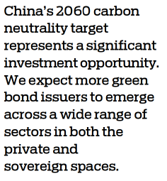 China's 2060 carbon neutrality target represents a significant investment opportunity. We expect more green bond issuers to emerge across a wide range of sectors in both the private and sovereign spaces. In addition, we expect further innovation in sustainable bond formats, such as China's carbon neutrality bond format, which is being viewed by some as an even greener bond given its stricter use of proceeds.