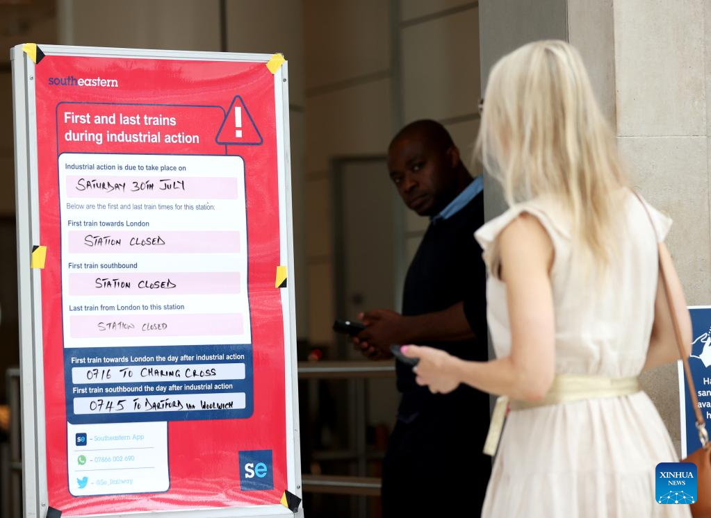 A passanger stands next to the gate of Waterloo East Station, which is closed due to strike, in London, Britain, July 30, 2022. [Photo/Xinhua]