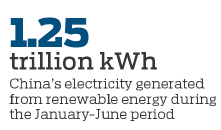 China generated 1.25 trillion kilowatt-hours of electricity from renewable energy during the January-June period, according to a release issued by the National Energy Administration on Tuesday.