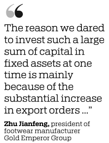"The reason we dared to invest such a large sum of capital in fixed assets at one time is mainly because of the substantial increase in export orders, which has boosted our confidence. In addition, the international markets' orders for athletic shoes have remained strong in recent months," Zhu said. He added that the company is expected to export 12 million pairs of sports shoes this year.