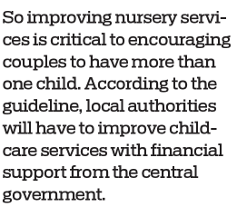 According to some surveys, one-third of urban families need nursery services, a demand the government has not been able to meet. So improving nursery services is critical to encouraging couples to have more than one child. According to the guideline, local authorities will have to improve childcare services with financial support from the central government. And subsidies and tax deductions will be introduced to reduce nursery costs, while steps will be taken to improve the quality of nursery services.