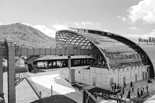 With a designed maximum speed of 80 kilometers per hour, the rail system is able to handle a two-car maglev train that can transport 88 people. The transit system is equipped with the Beidou Navigation Satellite System, 5G capabilities and smart sensing technologies.