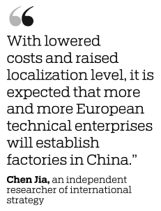"With lowered costs and raised localization level, it is expected that more and more European technical enterprises will establish factories in China," Chen added.