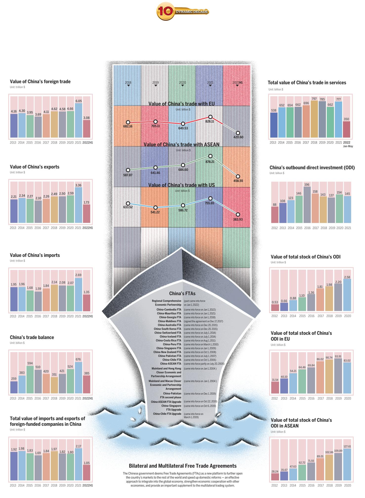 Editor's Note: To mark the 20th National Congress of the Communist Party of China, China Daily is producing a series of data graphics pages that highlight the nation's major achievements during the past decade. This, the 12th in the series, takes stock of China's tremendous strides in trade and investment, and reflects how bilateral and multilateral agreements have helped improve people's lives.