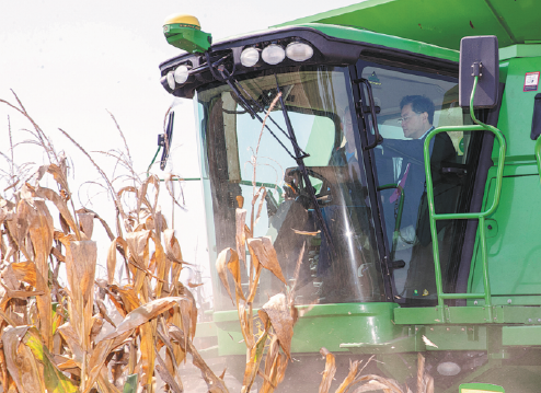 Qin and Stemme then drove a combine harvester together toward a cornfield. As the corn stalks fell one by one, the air was filled with the smell of corn.