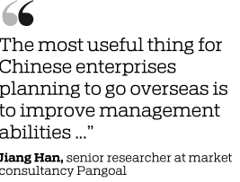 "The most useful thing for Chinese enterprises planning to go overseas is to improve management abilities, as they need to adapt to global organizational structures and diverse corporate cultures in different locations," said Jiang Han, a senior researcher at market consultancy Pangoal.