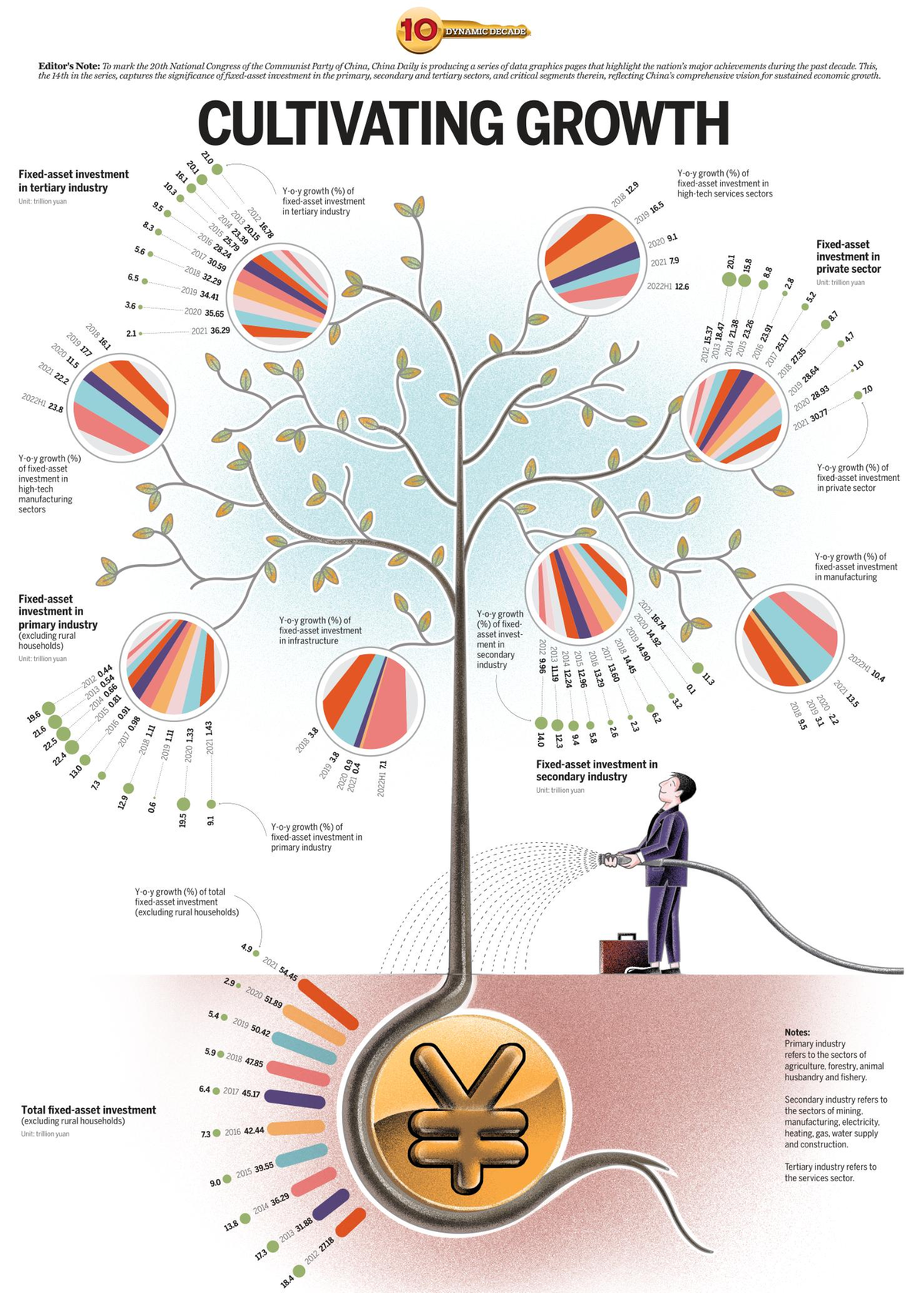 Editor's Note: To mark the 20th National Congress of the Communist Party of China, China Daily is producing a series of data graphics pages that highlight the nation's major achievements during the past decade. This, the 14th in the series, captures the significance of fixed-asset investment in the primary, secondary and tertiary sectors, and critical segments therein, reflecting China's comprehensive vision for sustained economic growth.