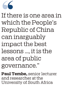 "If there is one area in which the People's Republic of China can inarguably impact the best lessons for both developed and developing countries in the Global South and North, it is the area of public governance. There in the sphere of governance systems and capabilities, the People's Republic of China has thrived and provided the institutional ammunition — revolutionarily so throughout human history — to drive the processes of opening up and reform," said Tembe in his book.