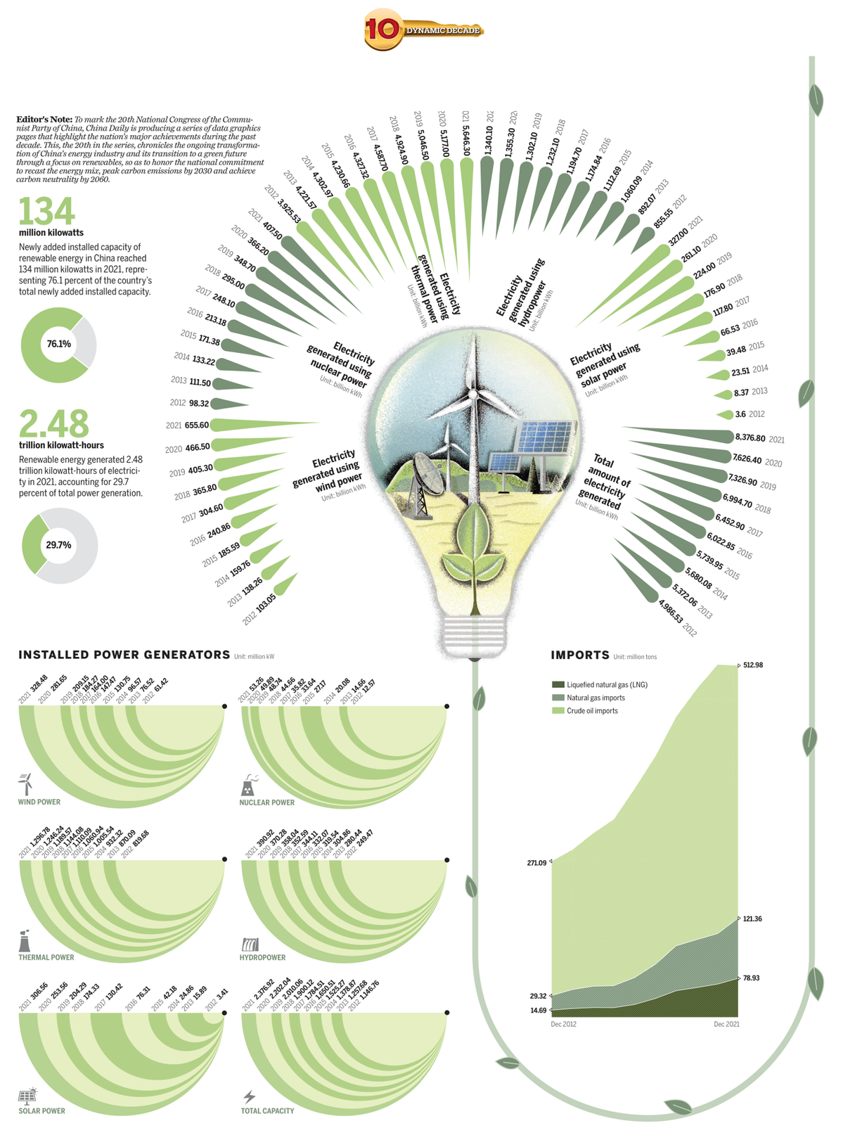 Editor's Note: To mark the 20th National Congress of the Communist Party of China, China Daily is producing a series of data graphics pages that highlight the nation's major achievements during the past decade. This, the 20th in the series, chronicles the ongoing transformation of China's energy industry and its transition to a green future through a focus on renewables, so as to honor the national commitment to recast the energy mix, peak carbon emissions by 2030 and achieve carbon neutrality by 2060.