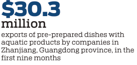 Zhanjiang companies exported about $30.3 million worth of pre-prepared dishes with aquatic products in the first nine months of this year.