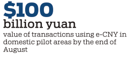 In late September, the mBridge platform — which explores multilateral cooperation regarding CBDC international payments — completed its first real-trade pilot test with four CBDCs including e-CNY, supporting more than $22 million in foreign exchange transactions. That amount appears to be small as official data showed the value of transactions using e-CNY in domestic pilot areas had topped 100 billion yuan ($13.8 billion) by the end of August, demonstrating e-CNY's current focus on domestic scenarios.