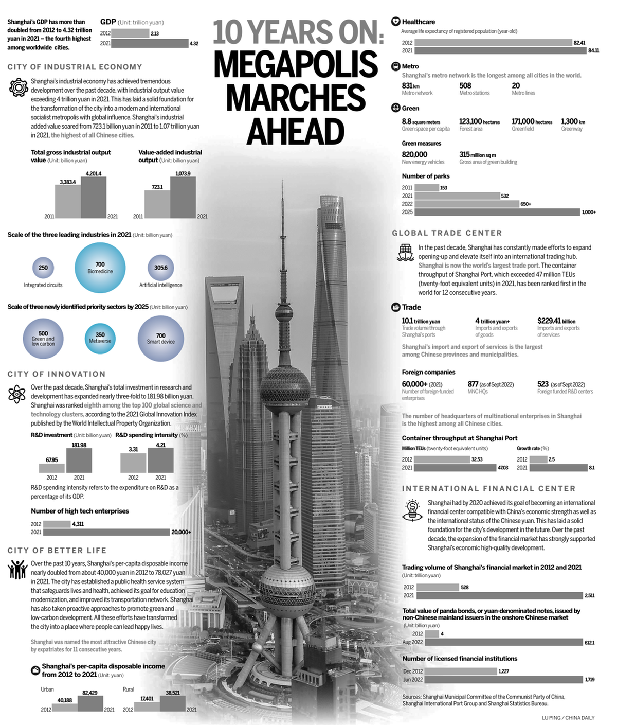 Such strengths were consolidated over the past decade, with Shanghai growing as an international financial center and becoming the world's largest commercial trading hub as well as a center of industries with high-quality development, officials said.